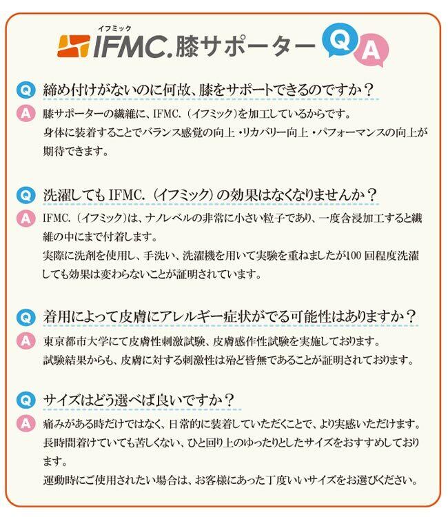 A:膝サポーターの繊維に、IFMC.(イフミック)を加工しているからです。身体に装着することでバランス感覚の向上・リカバリー向上・パフォーマンスの向上が期待できます。